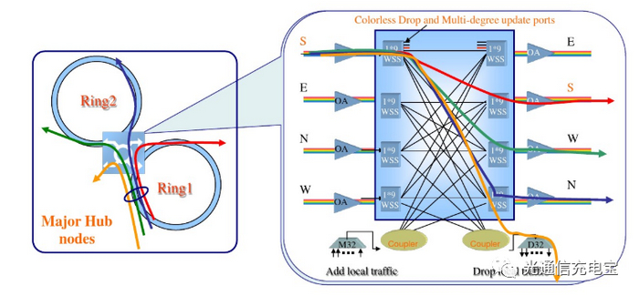 作為全光網(wǎng)的重要基礎(chǔ),OADM(光分插復(fù)用器)用來實(shí)現(xiàn)波長的上下話。主要有兩種,固定分插復(fù)用器(FOADM)和可重構(gòu)分插復(fù)用器(ROADM)。很明確,相比于FOADM,如圖11所示的ROADM可以實(shí)現(xiàn)任意波長輸入,任意端口輸出,具有方向無關(guān),波長無關(guān),無沖突、靈活帶寬,即(CDC-F)的特征。ROADM的出現(xiàn),使得遠(yuǎn)程靈活配置波長上下,快速開通業(yè)務(wù),自由升級擴(kuò)容,多維度波長調(diào)度,多波道功率均衡成為可能,極大地增加了光網(wǎng)絡(luò)的靈活性,并降低運(yùn)維成本。 當(dāng)前最新ROADM技術(shù)已經(jīng)可以支持最高32維度,Pbit級別的超大容量交叉,并且全光背板技術(shù)的出現(xiàn)極大降低了內(nèi)部連纖的難度。