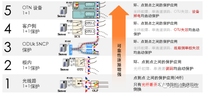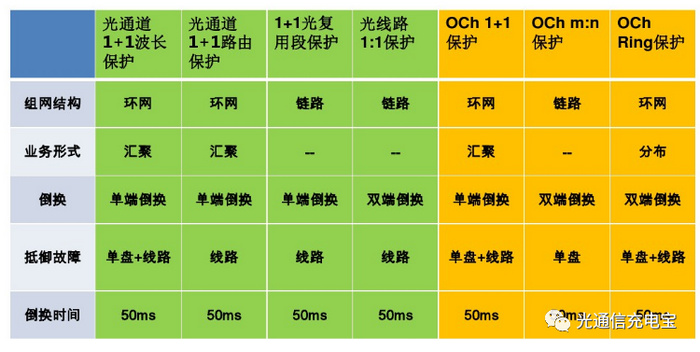 不同的保護(hù)方式的特點(diǎn)和應(yīng)用場景也略有些區(qū)別,見下表。所謂保護(hù)就是在單盤或線路上做冗余備份,倒換通常就是多發(fā)或并發(fā)選收了。