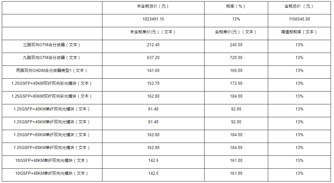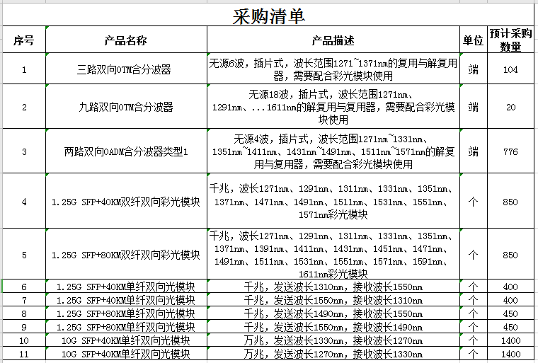 根據(jù)此前招標公告,該項目預(yù)計采購三路雙向OTM合分波器 、九路雙向OTM合分波器 、兩路雙向OADM合分波器類型1 、雙纖雙向彩光模塊 、單纖雙向光模塊等,具體產(chǎn)品信息詳見(采購清單)。