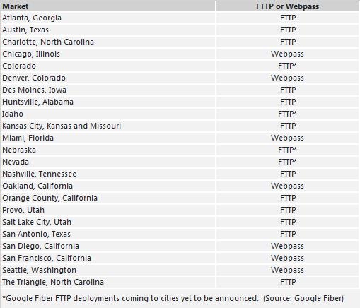 以下是谷歌光纖使用FTTP或其固定無線平臺Webpass,進(jìn)行和計劃中的網(wǎng)絡(luò)和服務(wù)部署情況: