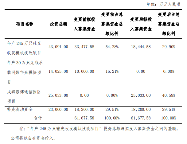博創(chuàng)科技表示:結(jié)合公司未來戰(zhàn)略規(guī)劃,充分利用新建的成都蓉博通信園區(qū)的設(shè)施和能力,公司擬將“年產(chǎn) 245 萬只硅光收發(fā)模塊技改項(xiàng)目”部分產(chǎn)能轉(zhuǎn)移至成都蓉博實(shí)施。經(jīng)過公司審慎評估,公司擬將該項(xiàng)目中 15,033.00 萬元募集資金調(diào)整至 “成都蓉博通信園區(qū)項(xiàng)目”,“年產(chǎn) 245 萬只硅光收發(fā)模塊技改項(xiàng)目”繼續(xù)實(shí)施,募集資金投資金額不足部分由公司自籌資金補(bǔ)足。