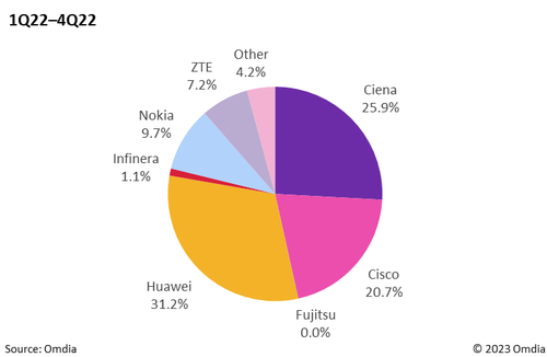 ICC訊(編譯:Nina)近日,領(lǐng)先的技術(shù)研究公司Omdia發(fā)布了2022年第四季度(4Q22)100G+相干光設(shè)備端口數(shù)據(jù),并深入分析了100G或更高速率WDM市場。報告顯示,與2021年相比,400G出貨量增長了55%,預計未來五年市場將保持高增長。過去四個季度(1Q22-4Q22),華為在400G出貨量方面保持領(lǐng)先。
