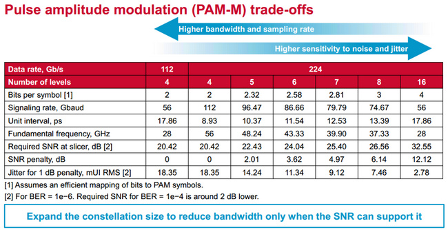 在112Gbps速率時(shí)代,為了避免信號基頻提高太多,業(yè)界普遍使用了PAM4(Pulse Amplitude Modulation)信號制式。這是以太網(wǎng)信號從使用了幾十年的NRZ(Non-Return Zero)信號制式上進(jìn)行的首次變革。在224Gbps速率時(shí)代,如果繼續(xù)沿用PAM4信號制式,信號基頻將達(dá)到56GHz,再加上需要考慮時(shí)域信號在頻域上的多次諧波,頻譜帶寬已經(jīng)遠(yuǎn)遠(yuǎn)超出了現(xiàn)有的PCB材料和電纜所能支持的信號傳輸頻率范圍。于是,PAM5-PAM8,甚至更高級別的PAM16成為了224Gbps Serdes的候選對象。