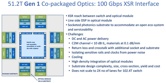 在第一代的光電共封裝交換芯片里,直接把現(xiàn)有光模塊里面的部件通過硅光技術(shù)集成到交換芯片內(nèi)部,使用超短距的100G-XSR電信號接口連接兩部分電路,芯片封裝上引出的光纖則直接輸出100Gbps波長的光信號。