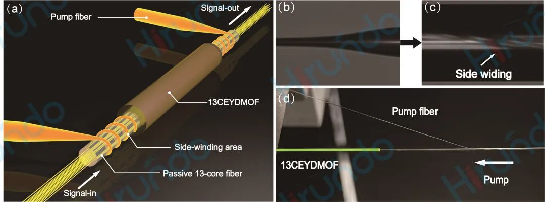 此外,花生形氣孔的設(shè)計有效提高了內(nèi)包層的數(shù)值孔徑(NA),同時減小了光纖的外徑,增強了光纖的機械靈活性。為了解決氣孔引起的耦合困難,我們采用了一種組合技術(shù),對13CEYDMOFA進行雙向泵浦。