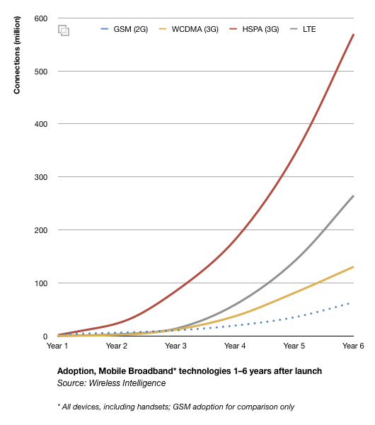 在未來五年,像Verizon AT&T和TeliaSonera之類的運(yùn)營(yíng)商會(huì)投資1000億美元,用于建設(shè)移動(dòng)寬帶網(wǎng),其速度比今天的有線寬帶連接平均速快10倍。一些運(yùn)營(yíng)商開始投資于新的LTE網(wǎng)絡(luò),它是SHSPA技術(shù)的演進(jìn)。GSMA稱LTE商用網(wǎng)絡(luò)推出已經(jīng)一年半,現(xiàn)在有100萬用戶。