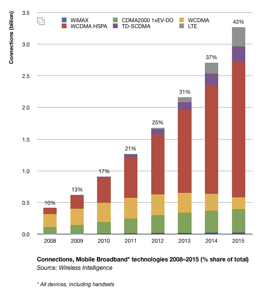 2008-2015年移動(dòng)寬帶連接的份額變化