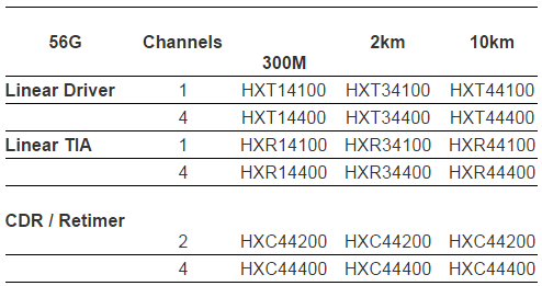 PAM4以太網(wǎng)應用的芯片組(包括驅(qū)動器、跨阻放大器TIA和CDR/重定時器芯片)也開始出樣。該芯片組支持56G通道,并且有多個款式滿足不同傳輸距離和通道驅(qū)動。