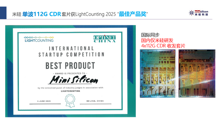 開展首日,米硅科技重點展示的4×112 Gbps PAM4 CDRTxRx全系列芯片憑借卓越的性能指標與領先的創(chuàng)新價值,榮獲大會組委會頒發(fā)的“光電技術創(chuàng)新獎”。這一殊榮不僅體現(xiàn)了行業(yè)對米硅科技持續(xù)研發(fā)投入的高度認可,更離不開廣大客戶與合作伙伴的長期信任與支持。
