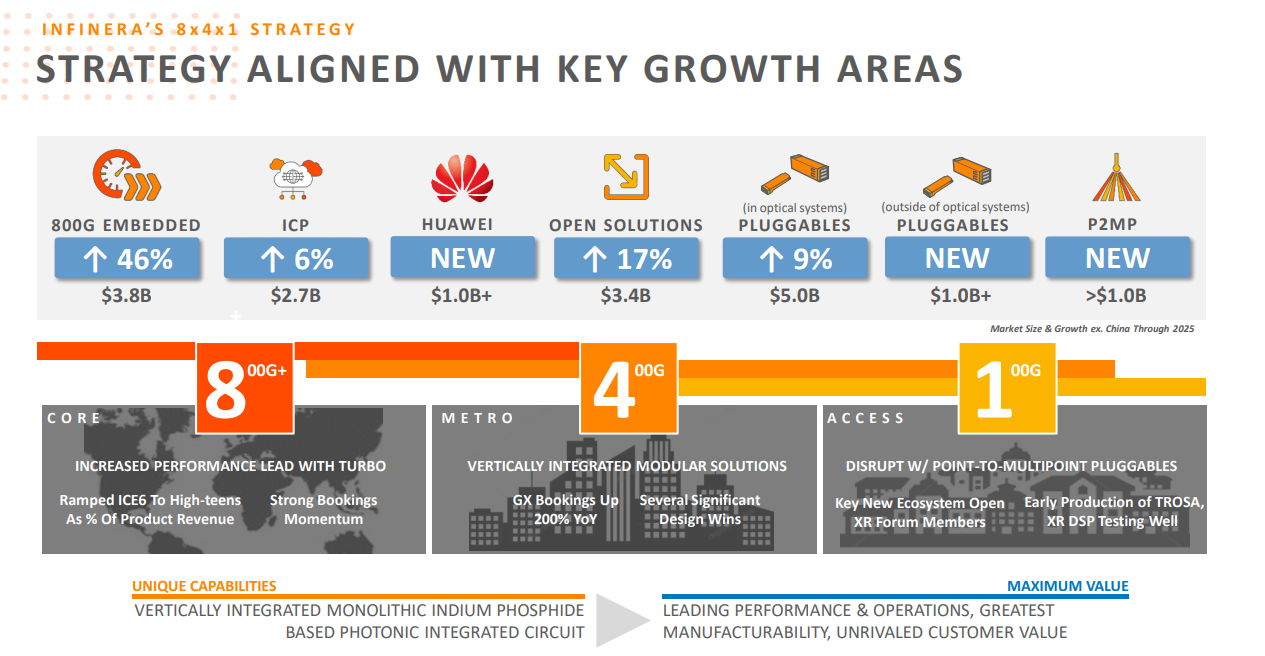 Infinera 首席執(zhí)行官 David Heard 表示:“我們第一財(cái)季的需求非常強(qiáng)勁,預(yù)訂量同比增長(zhǎng)兩位數(shù),積壓訂單創(chuàng)歷史新高。我們以比最初預(yù)期更快的速度和更大的規(guī)模贏得了多個(gè)新客戶交易。 然而,本季度末我們?cè)诙砹_斯的業(yè)務(wù)暫停,以及客戶項(xiàng)目完成延遲和成本上升對(duì)供應(yīng)鏈的影響,都削弱了我們的收入和利潤(rùn)率。在本季度,我們?cè)?8x4x1 戰(zhàn)略中取得了額外的成功里程碑,因?yàn)槲覀冊(cè)黾恿?ICE6 并開(kāi)始提前生產(chǎn)我們的可插拔產(chǎn)品的關(guān)鍵元素,這對(duì)我們未來(lái)的目標(biāo)市場(chǎng)和利潤(rùn)的擴(kuò)展至關(guān)重要。我們相信,我們最近的勝利、創(chuàng)紀(jì)錄的積壓和專注的執(zhí)行使我們能夠在下半年實(shí)現(xiàn)更高的收入增長(zhǎng)和利潤(rùn)率?!?