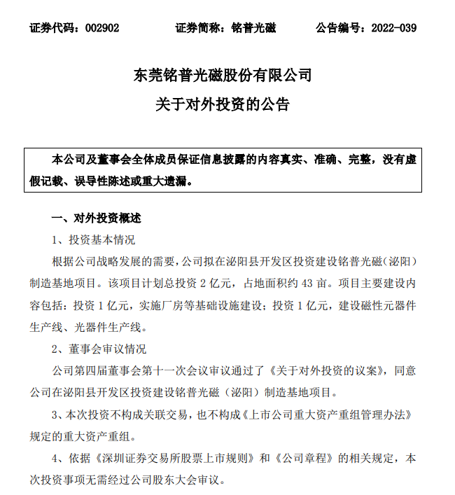 ICC訊 東莞銘普光磁股份有限公司(以下簡稱“銘普光電”或“公司”)發(fā)布關(guān)于對外投資的公告稱:根據(jù)公司戰(zhàn)略發(fā)展的需要,公司擬在泌陽縣開發(fā)區(qū)投資建設(shè)銘普光磁(泌陽)制造基地項(xiàng)目。該項(xiàng)目計(jì)劃總投資 2 億元,占地面積約 43 畝。項(xiàng)目主要建設(shè)內(nèi)容包括:投資 1 億元,實(shí)施廠房等基礎(chǔ)設(shè)施建設(shè);投資 1 億元,建設(shè)磁性元器件生產(chǎn)線、光器件生產(chǎn)線。