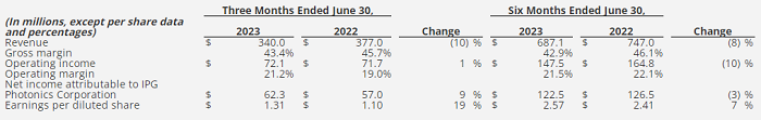 摘要:IPG截至2023年6月30日的2023年第二季度營收3.4億美元,同比下降10%。電動汽車推動焊接和清潔應用的持續(xù)增長,工業(yè)市場需求疲軟影響了銷售和前景。