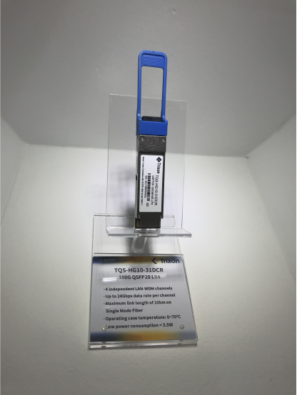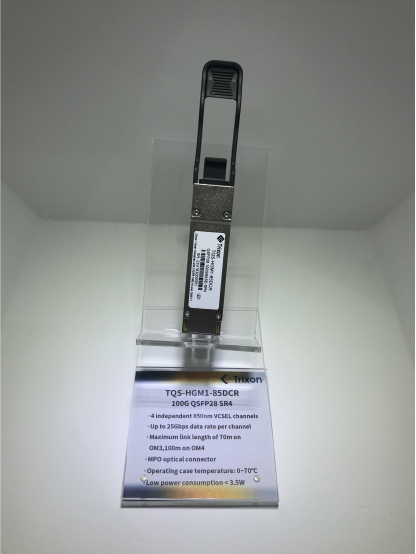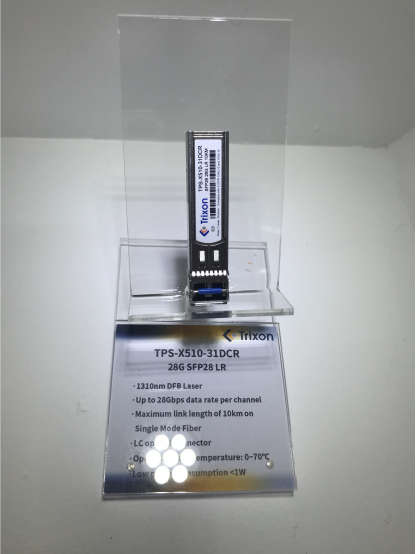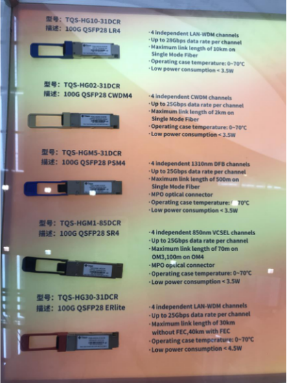 訊石到現(xiàn)場(chǎng)看到,此次參展的主打產(chǎn)品有100G QSFP28,100G CFP2/CFP4,40G QSFP+,10G SFP+/XFP,SGMII,100G QSFP28 AOC/DAC,40G QSFP+ AOC/DAC,25G SFP+ AOC/DAC,10G SFP+ AOC/DAC。