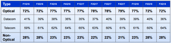 2018財(cái)年第三季度,Fabrinet銷售收入為3.32億美元,去年同期為3.67億美元。雖同比下滑,但超過之前預(yù)期的3.16-3.24億美元。從銷售收入的構(gòu)成來看,最近兩個季度光通信業(yè)務(wù)占72%,相比前幾個季度的77%~79%下滑;在光通信業(yè)務(wù)中,數(shù)通占36%,電信占64%。