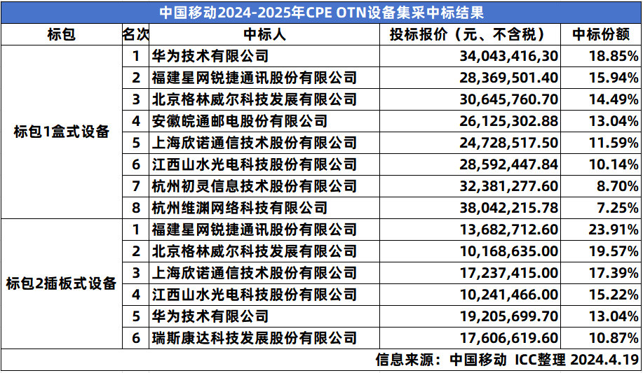 ICC訊 中國(guó)移動(dòng)今日公示了2024年至2025年CPE OTN設(shè)備的集采結(jié)果,華為、星網(wǎng)銳捷、格林威爾、皖通、欣諾、山水光電、初靈信息、維淵、瑞斯康達(dá)共9家中標(biāo)。