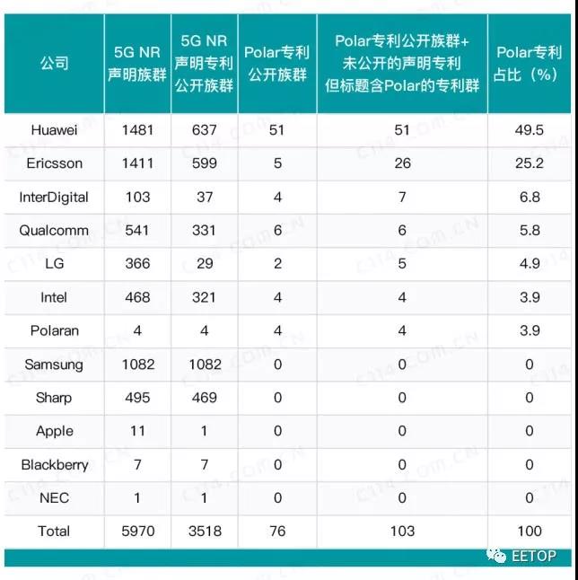 目前,5G Polar碼公布專利數(shù)量上,華為位列第一名,遠(yuǎn)遠(yuǎn)領(lǐng)先于高通。網(wǎng)絡(luò)上流傳了一份有關(guān)5G專利的數(shù)量清單。該份清單是以Polar碼為標(biāo)準(zhǔn)的專利技術(shù)。5G專利清單的詳細(xì)情況如下,截至2018年7月底,Polar碼技術(shù)領(lǐng)域共有103族專利,其中華為占據(jù)半壁江山,擁有51族專利,占比49.5%;愛立信位居第二,擁有26族,占總數(shù)的25.2%,美國Inter Digital公司以7族6.8%的占比位列第三。