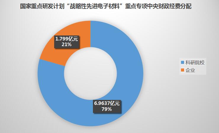 其中“戰(zhàn)略性先進(jìn)電子材料”重點專項共27個項目,除去4個需實施1-2年后評估擇優(yōu)的重點專項外,剩余23個重點專項共獲得中央財政經(jīng)費8.7627億元。科研院校依然是該方向的科研主力,包括北大、清華和中科院在內(nèi)的10余所科研院校共獲得中央財政經(jīng)費6.9637億元。