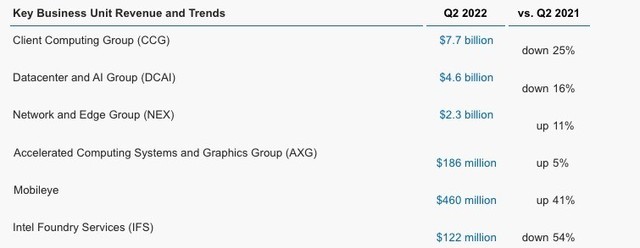 ICC訊 7月29日凌晨,英特爾公布了該公司的2022財(cái)年第二季度財(cái)報(bào)。財(cái)報(bào)顯示,英特爾英特爾客戶計(jì)算集團(tuán)第二季度凈營收為76.65億美元,相比之下去年同期為102.53億美元,同比下降25%;數(shù)據(jù)中心和人工智能集團(tuán)第二季度營收為46.49億美元,相比之下去年同期為55.47億美元,同比下降16%;網(wǎng)絡(luò)和邊緣集團(tuán)第二季度營收為23.33億美元,相比之下去年同期為21.05億美元,同比增長11%;英特爾加速計(jì)算系統(tǒng)和圖形業(yè)務(wù)部門第二季度營收為1.86億美元,相比之下上年同期為1.77億美元,同比增長5%;自動(dòng)駕駛部門Mobileye第二季度營收為4.60億美元,相比之下上年同期為3.27億美元,同比增長41%;代工服務(wù)事業(yè)部(Intel Foundry Services)第二季度營收為1.22億美元,相比之下上年同期為2.64億美元,同比下降54%。