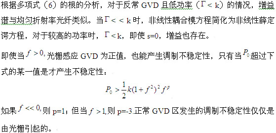在光柵結(jié)構(gòu)中的調(diào)制不穩(wěn)定性研究包括兩個(gè)電場分量,一個(gè)為前向傳播分量,一個(gè)為后向傳播分量。這些場分量的演變得到了耦合模方程。我們知道在光柵中,低強(qiáng)度的脈沖傳輸可以被近似的描述為非線性薛定諤方程。實(shí)際上,在一些限定條件下,可以獲得非線性薛定諤方程的調(diào)制不穩(wěn)定性的解。然而在高強(qiáng)度脈沖的情況下,要使用完整的耦合模方程,那么不穩(wěn)定性的特性比由非線性薛定諤方程所得出的更為復(fù)雜。這些特性包括在正常色散中的不穩(wěn)定性。