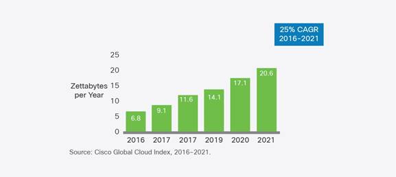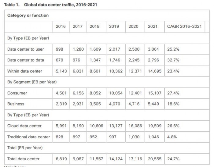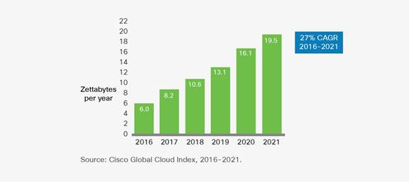 在報告中預(yù)測在2021年全球云數(shù)據(jù)中心流量年流量將達到19.5ZB,而在2016年這個數(shù)字僅僅為6.0ZB(1ZB等于10億TB)。2016年云數(shù)據(jù)中心流量占總數(shù)據(jù)中心流量的88%,而在2021年這個數(shù)字有望攀升至95%。