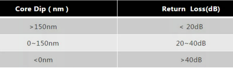 光纖纖芯的內(nèi)凹陷會(huì)造成MTP/MPO產(chǎn)品端接時(shí),光纖之間形成“Air Gap空隙間隙”,從而直接(主要)影響到系統(tǒng)“Return Loss回波損耗”指標(biāo)。Core Dip指標(biāo)與Return Loss回波損耗的對應(yīng)關(guān)系如下表所示,其中Core Dip指標(biāo)正數(shù)表示“凹陷”,負(fù)數(shù)表示“凸出”,Return Loss定義為相同規(guī)格的MTP/MPO產(chǎn)品對接測試,而不是對直接對空氣的反射。