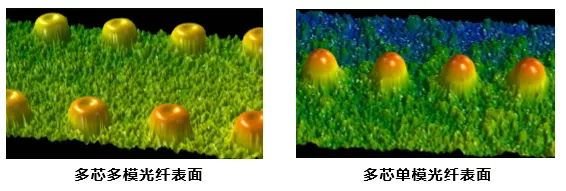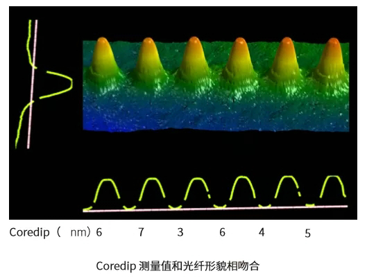 另外,對多芯MTP/MPO光纖連接器測量光纖表面⑥纖芯凹陷(Core Dip)有著重要意義。由于光纖的纖芯相對于包層材質(zhì)較軟,因此在研磨過程中更容易被切削,從而形成纖芯(相對于包層)的凹陷,稱之為“Core Dip”。