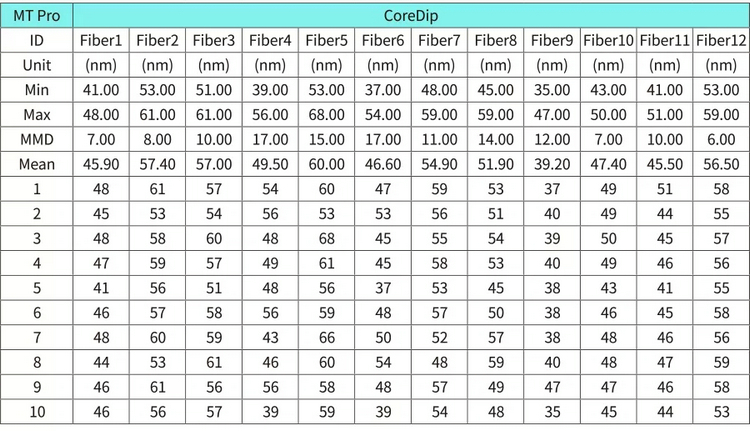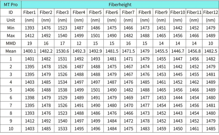 MT Pro使用了精度達(dá)0.1nm的激光干涉儀對系統(tǒng)進(jìn)行了準(zhǔn)確的標(biāo)定。確保了 MTP/MPO 測量的ROC、Fiber height和Coredip等參數(shù)準(zhǔn)確性和一致性。