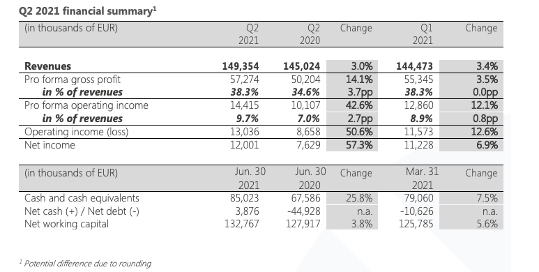 2021年第二季度,ADVA營(yíng)收1.49億歐元,與去年同期的1.45億歐元相比同比增長(zhǎng)3%。上個(gè)季度營(yíng)收1.44億歐元,環(huán)比增長(zhǎng)3.4%。本季度營(yíng)收增長(zhǎng)主要是來(lái)自通信服務(wù)提供商以及私營(yíng)企業(yè)和政府的大量訂單。ADVA 2021 年第二季度毛利率38.3%,去年同期為34.6%,上個(gè)季度毛利率為38.3%。2021年第二季度凈收入1200.1萬(wàn)歐元,相比去年同期的762.9萬(wàn)歐元增長(zhǎng)57.3%,比上個(gè)季度的1122.8萬(wàn)歐元增長(zhǎng)6.9%。
