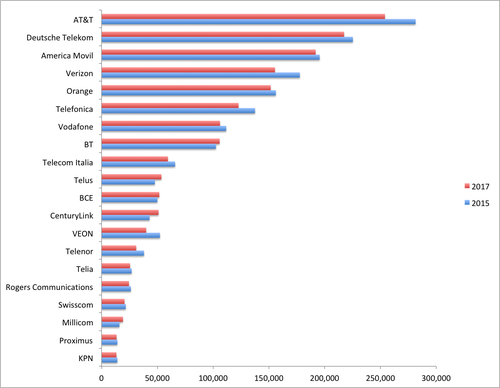 電信公司之間的收購合并是造成裁員的原因之一,2015年AT&T宣布以485億美元收購DirecTV(付費電視提供商)之后仍在裁員,美國電信運營商的失業(yè)人數(shù)達到了14540人。值得注意的是,排名前20位的一些運營商報告了較低的員工數(shù)字,并不是因為他們裁員,而是因為他們已經出售了某些業(yè)務并將員工轉移到了其他公司。例如,Telenor ASA將一家擁有約4000名員工的印度子公司出售給Bharti Airtel。