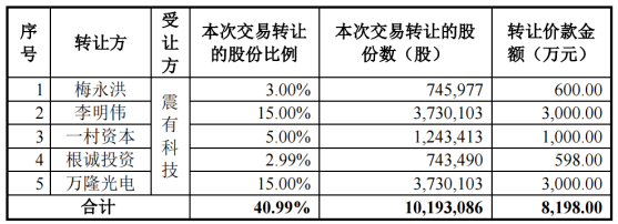 早在2020年12月4日,震有科技就已召開會(huì)議,審議通過了《關(guān)于使用自有資金收購杭州晨曉科技股份有限公司部分股權(quán)的議案》,同意公司以自有資金3000萬元現(xiàn)金收購杭州萬隆光電設(shè)備股份有限公司持有的杭州晨曉15%的股權(quán)。同日,萬隆光電又簽署了《關(guān)于杭州晨曉科技股份有限公司之股份轉(zhuǎn)讓協(xié)議》,將其所持杭州晨曉15%、15%、5%、2.99%的股份分別轉(zhuǎn)讓給震有科技、李明偉、一村資本、根誠投資。