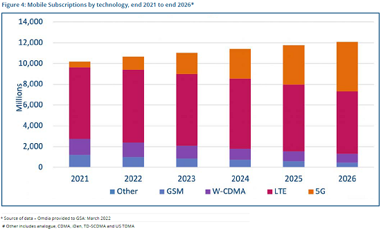 2021年底至2026年底,以GSM用戶為代表的市場(chǎng)份額將從11.3%下降至3.7%,以W-CDMA為代表的份額將從15.2%下降至6.9%%。到2026年底,5G用戶將占全球移動(dòng)用戶市場(chǎng)的39.4%(47.6億用戶),盡管LTE用戶仍將占全球移動(dòng)用戶總數(shù)的49.9%,但已遠(yuǎn)低于2021年的67.7%。