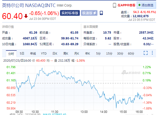 ICC訊 英特爾今天公布了2020財(cái)年第二季度財(cái)報(bào)。當(dāng)日,英特爾股價(jià)在納斯達(dá)克常規(guī)交易中下跌0.65美元,報(bào)收于60.40美元,跌幅為1.06%。在截止發(fā)稿的盤后交易中,英特爾股價(jià)跌超10%,過去52周,英特爾的最高價(jià)為69.29美元,最低價(jià)為43.63美元。