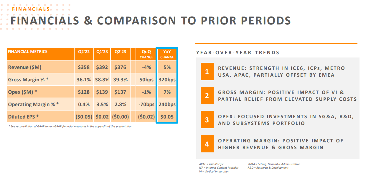 Infinera首席執(zhí)行官David Heard表示:“二季度是又一個(gè)穩(wěn)健的季度,營(yíng)收、利潤(rùn)率和每股收益都超出了市場(chǎng)預(yù)期,高于我們預(yù)期區(qū)間的中點(diǎn)。與去年同期相比,我們本季度的收入增長(zhǎng)了5%,今年上半年增長(zhǎng)了10%,季度毛利率增長(zhǎng)了300多個(gè)基點(diǎn)。我們繼續(xù)在系統(tǒng)業(yè)務(wù)中與主要電信服務(wù)提供商和超大規(guī)??蛻糈A得新的戰(zhàn)略交易,并且還收到了子系統(tǒng)業(yè)務(wù)的額外訂單。雖然下半年的行業(yè)前景不樂(lè)觀,客戶正在減少庫(kù)存和放緩新技術(shù)投資的步伐,但我們?nèi)匀粚?duì)我們?cè)?023年實(shí)現(xiàn)每股收益擴(kuò)張的計(jì)劃充滿信心,我們的目標(biāo)是到2025-2026年每股收益至少達(dá)到1美元?!?