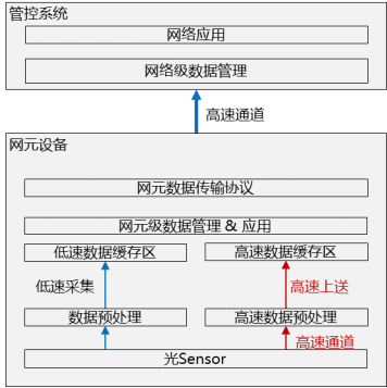 網(wǎng)元設(shè)備按照數(shù)據(jù)采集量的大小和時間精度分為高速采集和低速采集。硬件上,在網(wǎng)元設(shè)備為關(guān)鍵Sensor開辟快速外送數(shù)據(jù)到硬件通道,使用高速緩存區(qū)存儲多端口高精度數(shù)據(jù)(如毫秒級);軟件上,構(gòu)建統(tǒng)一大采集數(shù)據(jù)框架,抽象建模光Sensor數(shù)據(jù)采集項,靈活控制多單板、多端口的數(shù)據(jù)并發(fā)采集,并使用內(nèi)存共享技術(shù)高效讀寫。