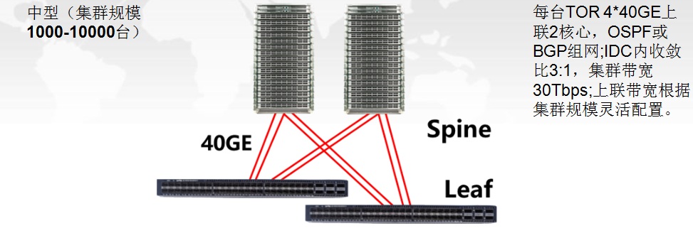 c)通過(guò)TOR上的服務(wù)器接入數(shù)量和上聯(lián)40G鏈路數(shù)量控制單TOR收斂比,通過(guò)提高核心設(shè)備接口密度擴(kuò)展單集群服務(wù)器規(guī)模。