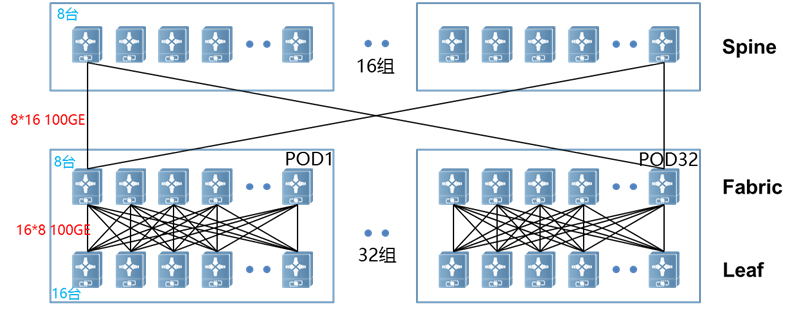 每臺(tái)Fabric交換機(jī), 有32個(gè)100GE,16個(gè)下連16臺(tái)Leaf,16個(gè)上連至16組Spine;每個(gè)POD 8臺(tái)Fabric交換機(jī),共32個(gè)POD;