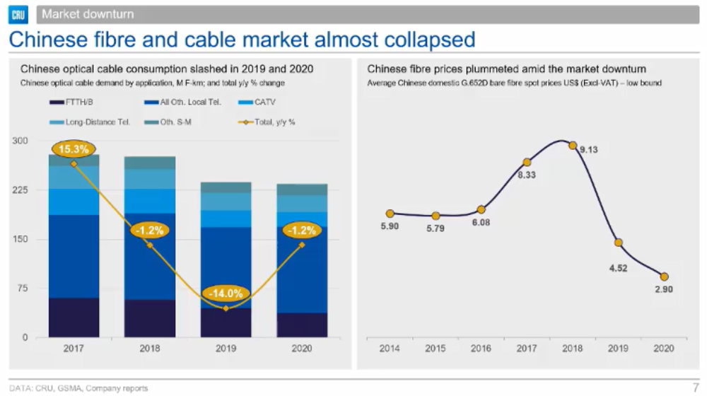 由于需求減少和產(chǎn)能過剩,過去兩年中國光纖光纜市場幾乎崩潰。需求方面,2019年同比下降14%,2020年再降1.2%。光纖光纜價格也在整體市場低迷的情況下急劇下降,G.652D光纖價格從2018年的約9.13美元/芯公里,2019年下降到約4.52美元/芯公里,2020年進一步下跌至約2.90美元/芯公里,多數(shù)光纖光纜生產(chǎn)商處于虧損的邊緣。