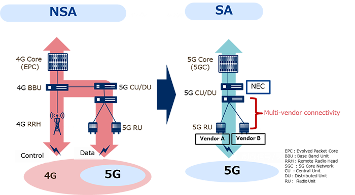 Transition from the NSA system combining 4G cores and 5G base stations to the SA system combining 5G cores and 5G base stations