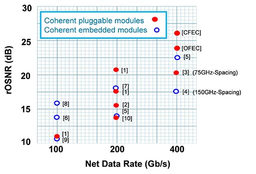 圖3 不同可插拔和嵌入式模塊在100、200、400Gb/s要求的光信噪比(OSNR)