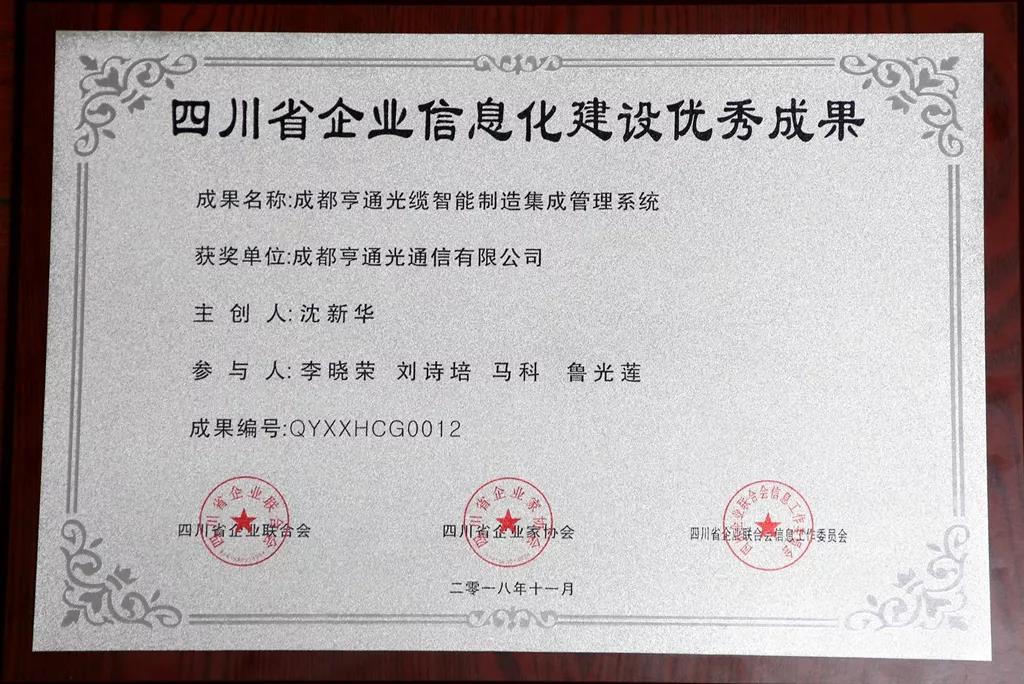 近日,四川省企業(yè)聯(lián)合會信息工作委員會第二屆二次理事會暨四川省企業(yè)信息化年會在成都隆重召開,亨通通信產(chǎn)業(yè)集團成都亨通光通信有限公司“光纜智能制造集成管理系統(tǒng)”項目,在50多家川央企、省屬國企和民營企業(yè)中脫穎而出,獲評四川省企業(yè)信息化建設優(yōu)秀成果獎。