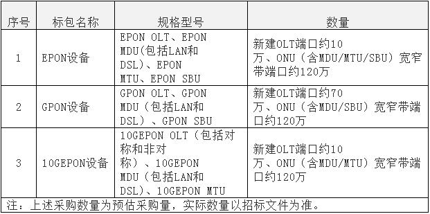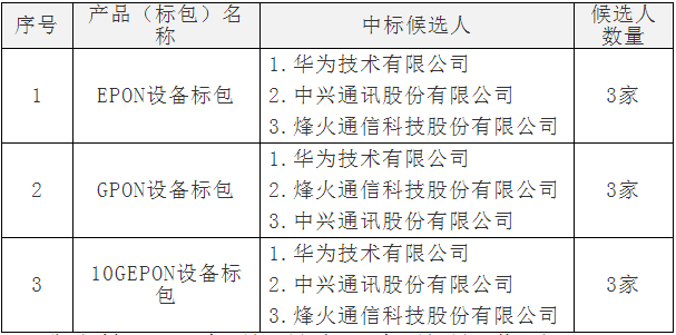 上圖顯示,EPON/GPON、10G PON三個標包的中標廠商均是華為、中興通訊、烽火通信三家,名次相同。