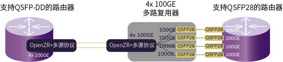 在所有路由器尚未遷移到400GE的運(yùn)營商網(wǎng)絡(luò)中,在OpenZR+光模塊中部署4x100GE多路復(fù)用非常有價(jià)值。這種4x100GE模式可以讓支持400GE功能的路由器和具有100GE功能的路由器互通。采用這種布局的例子如下所示。承載400G OpenZR+光模塊的4x100GE多路復(fù)用器可以將路由器上的400G OpenZR+接口分支連接到遠(yuǎn)端路由器上的4個(gè)100GE QSFP28端口。