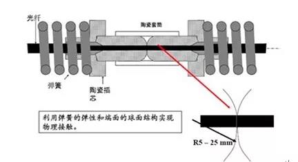 1) 常規(guī)LC/SC/FC等連接器用的陶瓷插芯,一個(gè)插芯里一根光纖,為了保證對(duì)接時(shí)光纖完全接觸,因此陶瓷插芯采用的“球面研磨技術(shù)”,如下圖所示:
