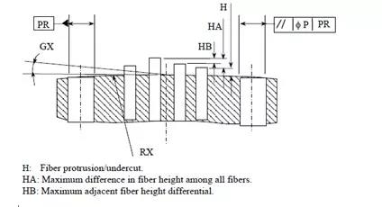 4) 研磨角度公差是必然存在的,那么如何才能解決光纖對(duì)接間隙問(wèn)題。因此就需要讓光纖凸出MT插芯端面,如下圖所示為IEC 61755-3-3對(duì)于光纖高度的定義,以及MT干涉儀測(cè)量的光纖高度3D/2D圖形:
