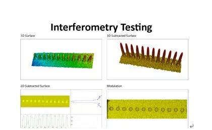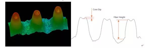1) Core Dip描述:由于光纖的纖芯相對(duì)于包層材質(zhì)較軟,因此在研磨過(guò)程中更容易被切削,從而形成纖芯(相對(duì)于包層)的凹陷,稱之為“Core Dip”。如下圖所示,即多模MT/MPO產(chǎn)品的光纖纖芯“Core Dip”