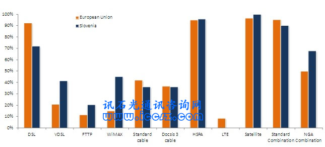 斯洛文尼亞使用廣范圍的接入技術(shù)來(lái)達(dá)到良好的超高速寬帶覆蓋,并成為歐盟第八高覆蓋的國(guó)家。很少有國(guó)家在三種接入技術(shù)上擁有如此強(qiáng)的態(tài)勢(shì)。為有效且經(jīng)濟(jì)地達(dá)到家庭覆蓋,有組織性地推出與其說(shuō)是一種重疊,不如說(shuō)是一種相互補(bǔ)充。