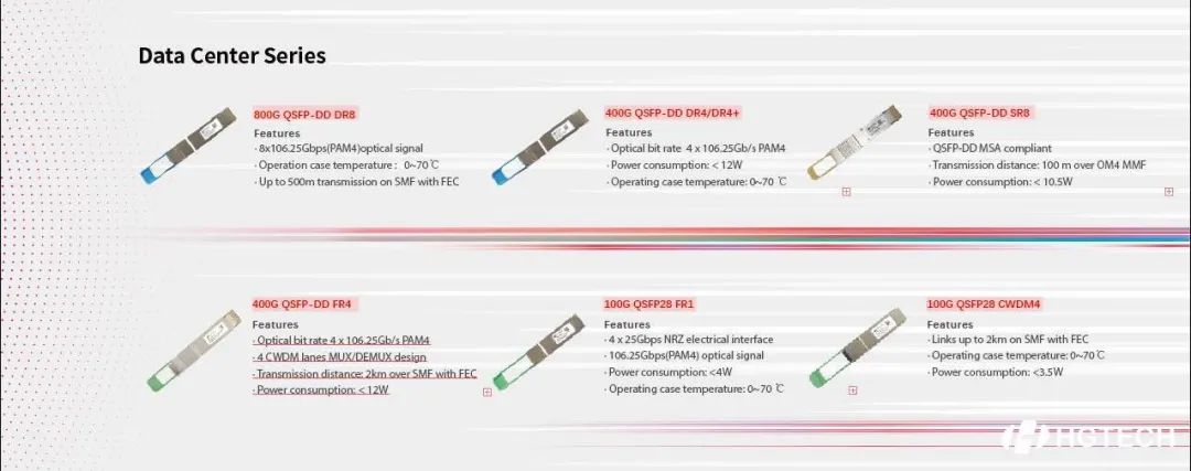 800G DR8亮點(diǎn):此款產(chǎn)品采用QSFP-DD封裝,帶制冷EML方案,采用7nm 8通道PAM4 DSP芯片,單通道速率高達(dá)100Gbps,具備功耗低、速率高等特點(diǎn),滿足下一代數(shù)據(jù)中心應(yīng)用。