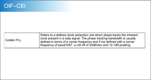 恢復(fù)出的時鐘信號抖動取決于壓控振蕩器的固有抖動和鎖相環(huán)的環(huán)路帶寬,環(huán)路能夠追蹤并抑制環(huán)路帶寬內(nèi)的抖動,忽略環(huán)路帶寬外的抖動,超過環(huán)路帶寬截止頻率越多,抑制效果越差,圖 5為我們展示了一個抖動傳遞曲線。環(huán)路帶寬外對抖動抑制和頻率的關(guān)系成為帶外滾降系數(shù),在諸多標(biāo)準(zhǔn)協(xié)議中有定義完美鎖相環(huán)“Golden PLL”帶外滾降系數(shù)為20dB/十倍頻以及具有和數(shù)據(jù)速率恒定比例的環(huán)路帶寬數(shù)值(當(dāng)輸入數(shù)據(jù)速率變化時環(huán)路帶寬應(yīng)隨之改變)。
