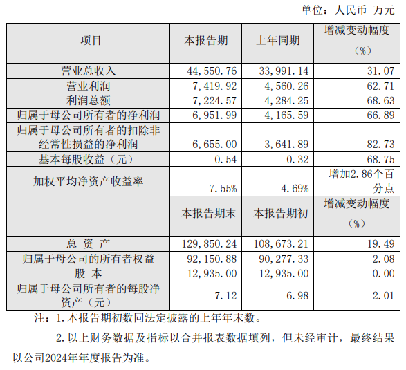 關于業(yè)績增長的原因,公告指出,2024年騰景科技實現營業(yè)總收入4.45億元,同比增長31.07%,主要原因是公司積極把握AI算力驅動下高速光通信元器件需求增長的市場機遇,進一步擴大光通信業(yè)務規(guī)模;生物醫(yī)療、半導體設備等新興應用領域業(yè)務持續(xù)開拓,光學模組產品收入增速明顯。2024年公司實現歸屬于母公司所有者的凈利潤6951.99萬元,同比增長66.89%;實現歸屬于母公司所有者的扣除非經常性損益的凈利潤6655萬元,同比增長82.73%。關于利潤增長的主要原因是公司營業(yè)收入增長,產品結構優(yōu)化,經營效率提升,毛利率水平逐步上升,對業(yè)績產生正向影響。