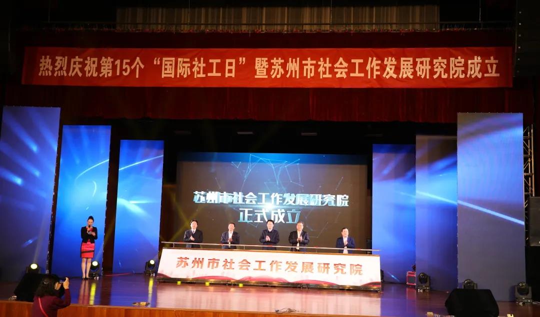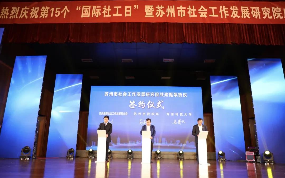 3月15日下午,由蘇州市民政局、蘇州科技大學(xué)、蘇州通鼎社會工作發(fā)展基金會聯(lián)合主辦的慶祝第15個“國際社工日”暨蘇州市社會工作發(fā)展研究院成立儀式在蘇州科技大學(xué)舉辦。省民政廳副廳長周恒新、蘇州市政府副市長曹后靈、蘇州市民政局局長蔣亞亭、蘇州科技大學(xué)校長姜朋明、通鼎集團(tuán)董事局主席沈小平等領(lǐng)導(dǎo)為研究院成立揭牌。